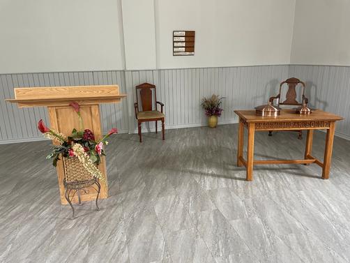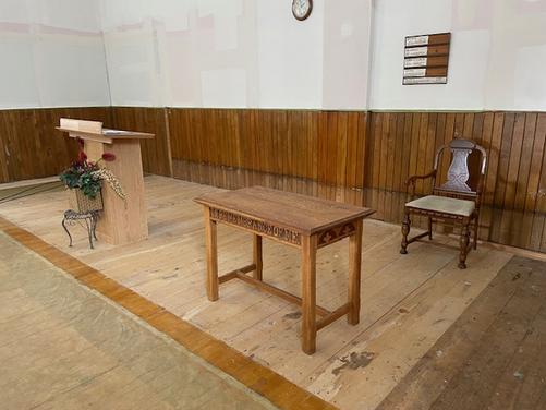The Lord's Table is an antique, again with us since 1990. It is the exact same 'carving' and style one can find in a local church building turned 'museum' the building of which was salvaged when the local dam was built, flooding a number of 'lost villages' during the late fifties. The table historically goes back much more than that. What I did do was, take the table apart piece-by-piece, and refinish it.